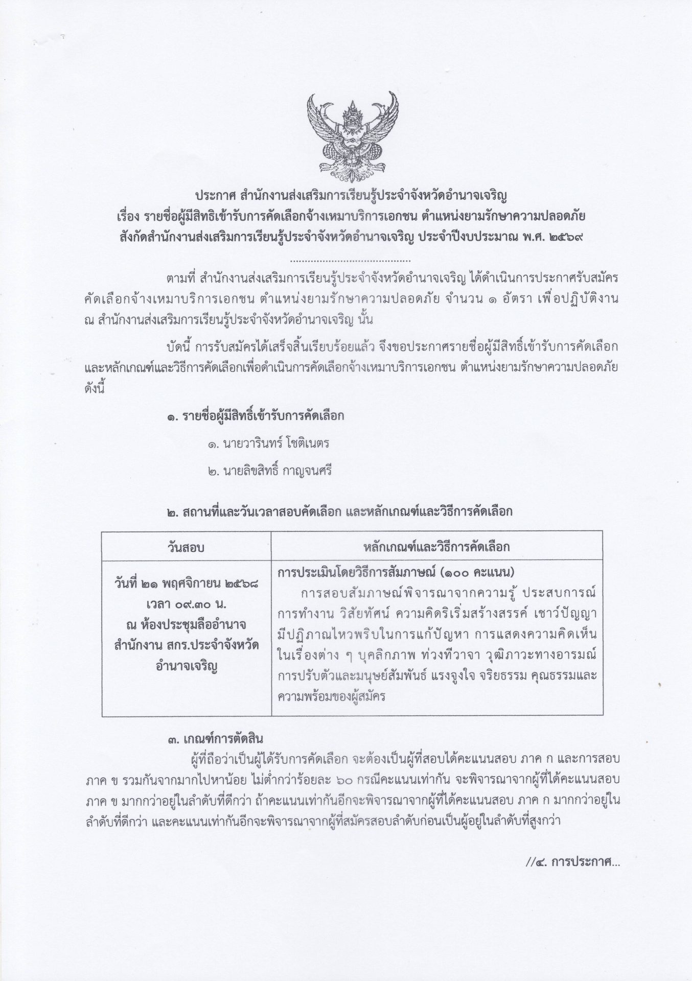 รายชื่อผู้มีสิทธิเข้ารับการคัดเลือกจ้างเหมาบริการเอกชน ตำแหน่งยามรักษาความปลอดภัย 20 พฤศจิกายน 2025 pornchai