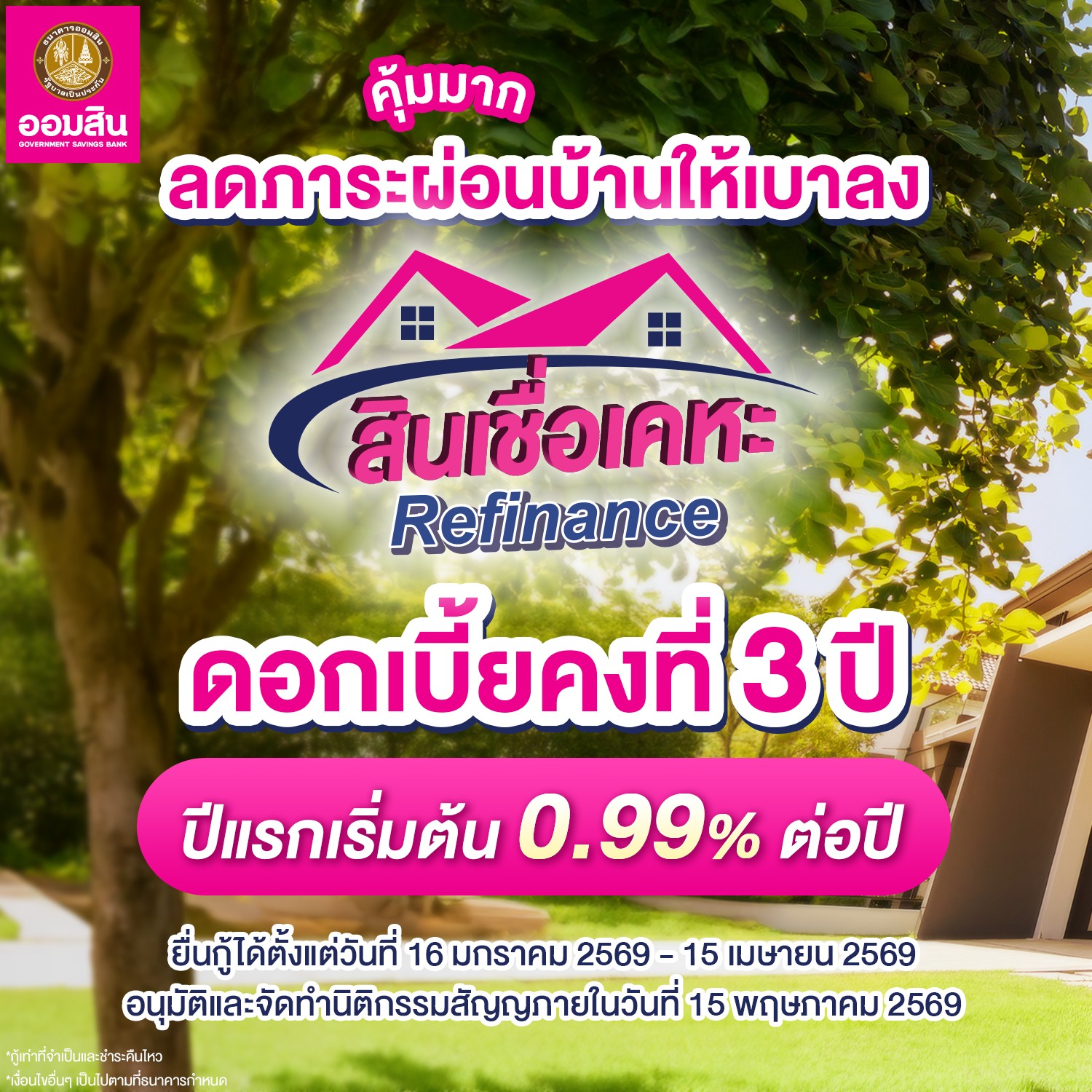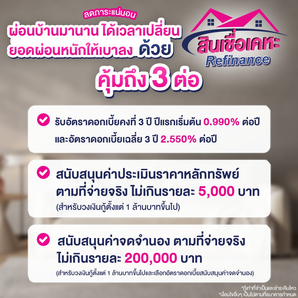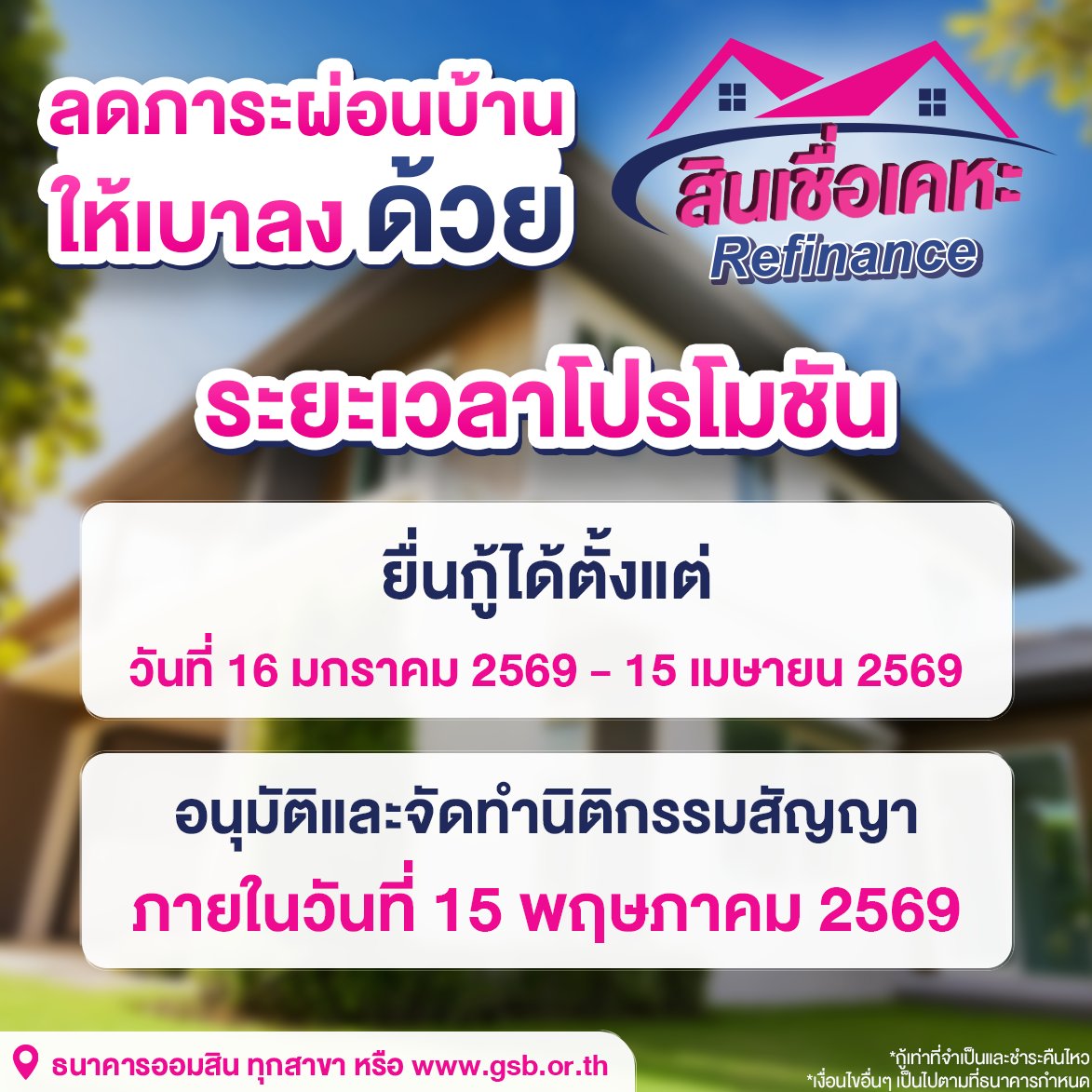 สินเชื่อเคหะ Refinance ยื่นกู้ตั้งแต่วันที่ 16 ม.ค. – 15 เม.ย. 2569 อนุมัติและจัดทำนิติกรรมสัญญา ภายในวันที่ 15 พ.ค. 2569