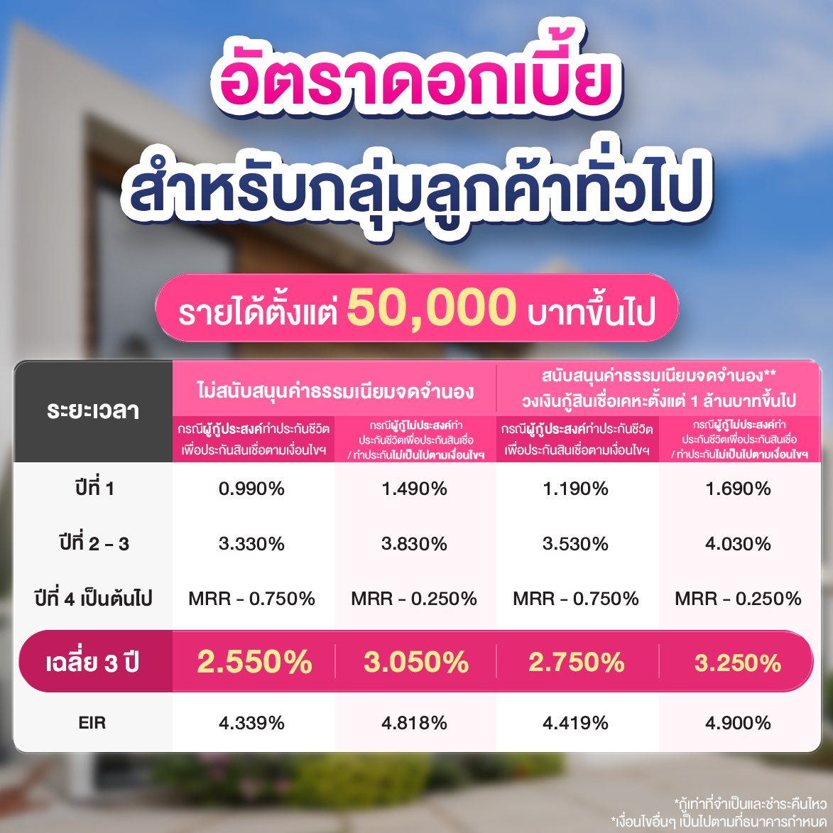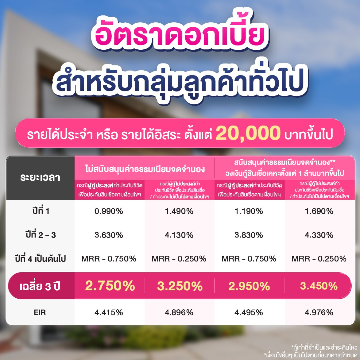 อัตราดอกเบี้ยคงที่ 3 ปี ปีแรกเริ่มต้น 0.990% ต่อปี และอัตราดอกเบี้ยเฉลี่ย 3 ปี 2.750% ต่อปี