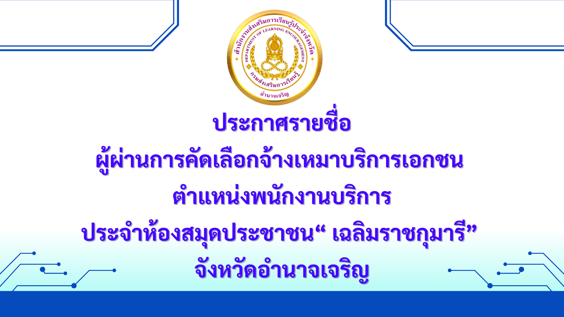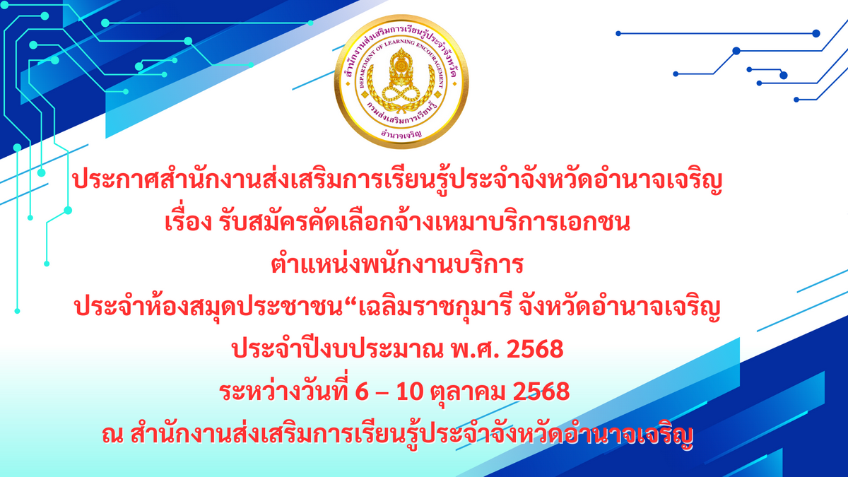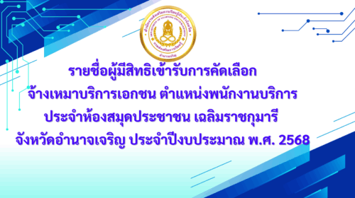 เรื่อง รับสมัครคัดเลือกจ้างเหมาบริการเอกชน ตำแหน่งพนักงานบริการ ประจำห้องสมุดประชาชน“เฉลิมราชกุมารี จังหวัดอำนาจเจริญ ประจำปีงบประมาณ พ.ศ. 2568 19 ตุลาคม 25611 ตุลาคม 2025ratchakarn6ข่าวรับสมัคร, ข่าวเด่น/จดหมายข่าวประชาสัมพันธ์, ประกาศผลการประกวดราคาจัดซื้อจัดจ้าง